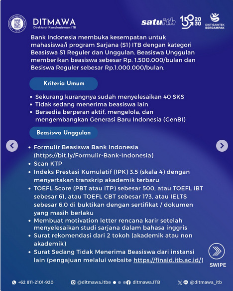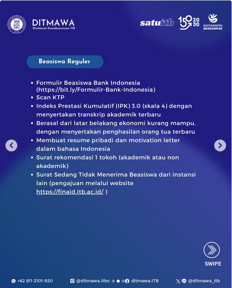 Informasi selengkapnya melalui website kemahasiswaan ITB: