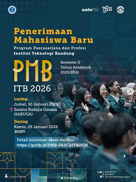 Rangkaian Penyambutan Mahasiswa Baru Program Pascasarjana dan Profesi Institut Teknologi Bandung Semester II Tahun Akademik 2024/2025 siap dilaksanakan! Rangkaian ini akan digelar pada 29 Januari 2026 secara daring dan 30 Januari 2026 secara luring. Ketahui informasi selengkapnya melalui laman https://admission.itb.ac.id/!