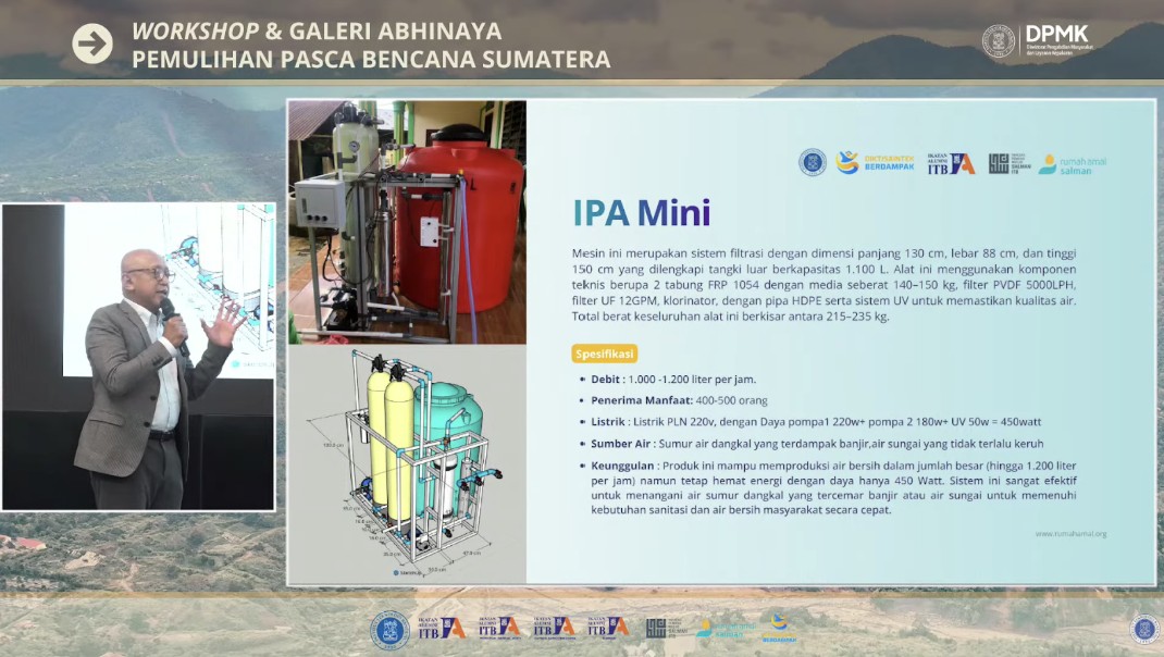 Sementara itu, di Sumatera Utara, ITB bekerja sama dengan Rumah Amal Salman menghadirkan solusi atas keterbatasan akses air bersih. Ketua Umum Yayasan Rumah Amal Salman, Mipi Ananta Kusuma, menjelaskan bahwa timnya merakit Instalasi Pengolahan Air (IPA) Mobile langsung di lokasi bencana di Medan, alih-alih mengirimkan unit jadi dari luar daerah.