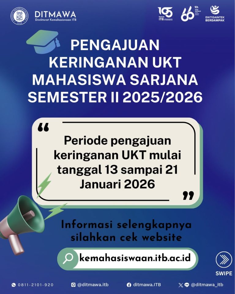 Institut Teknologi Bandung membuka kembali pengajuan keringanan UKT Semester II 2025/2026 untuk semua mahasiswa S1 ITB.