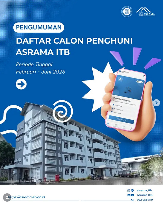 Selamat kepada mahasiswa yang dinyatakan lolos sebagai calon penghuni Asrama ITB periode FebruariāJuni 2026.